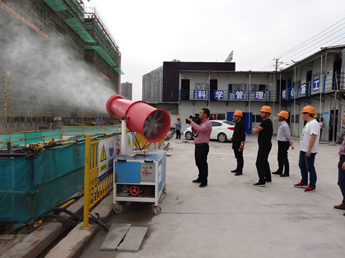 在施工现场,工作人员现场演示了高炮喷雾的防尘降尘效果。
