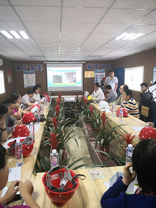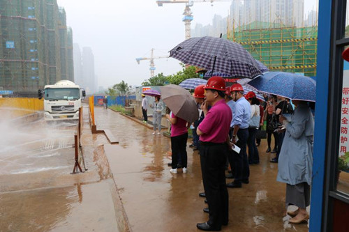国宾府项目经理郭国权向来宾介绍了广宏建设的企业理念、经营策略和国宾府工程生产进展、质量安全管理以及2018年以来项目部勇夺第一季度综合成绩美的地产第一、4月份湖南区域第一的成绩,重点汇报了项目部在建筑扬尘和噪音处理上的工作。他说,在建筑扬尘和噪音处理上,项目部严格按照《建筑施工安全检查标准》(JGJ59-2011)落实到位,做到裸图绿化覆盖率100%、施工围挡率100%、材料堆放和建筑垃圾集中堆放覆盖率100%、施工现场道路硬化率100%、冲洗车辆设备配备率100%、工作面湿法作业率100%、渣土运输覆盖率100%、50000平方以上建设项目安装扬尘监控率100% 。