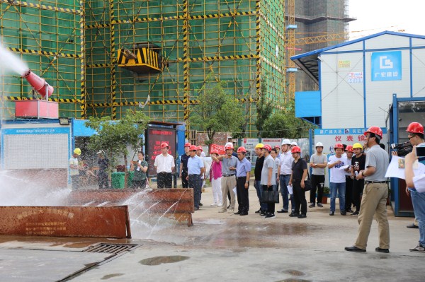 项目经理郭国权向来宾介绍了国宾府项目在工程生产和质量安全上严格按照精细化、标准化、程序化、科学化目标管理,注重细节和工程节点,多次勇夺全国和湖南区域美的地产在建项目检查评比第一名,获得美的地产和集团总部的表彰。在建筑垃圾和扬尘噪声控制上,从制度建设、责任落实到工地现场道路硬化、场地绿化、渣土运输全覆盖、防尘雾化设备配置及应用等多方面进行了规定,配置了雾炮机、塔吊喷淋、噪音检测仪等设备,确定专人负责,专人清扫施工现场,时刻保持干净整洁,对噪音和扬尘进行实时检测控制,在施工噪音、防尘降尘方面达到了预期效果。