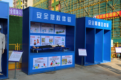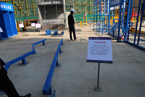 安全生产体验区,分有安全用电、撞击、高空下坠、平衡木、急救等体验区。