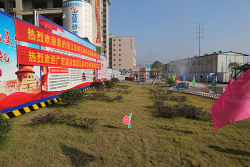 进入项目,映入眼帘的是广宏建设欢迎您的巨幅彩画,背景为项目新型技术应用的建筑楼实景。项目空地上铺着绿色草坪。在项目办公楼边还建有供人小憩的凉亭。