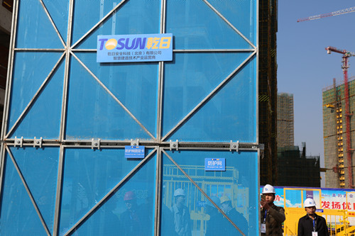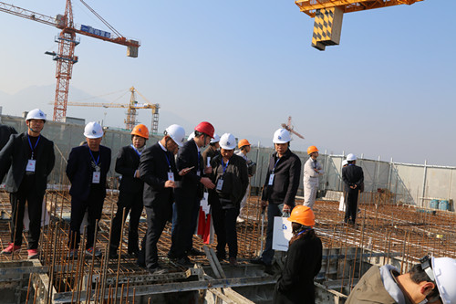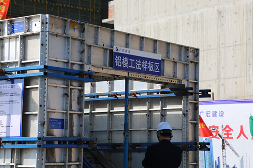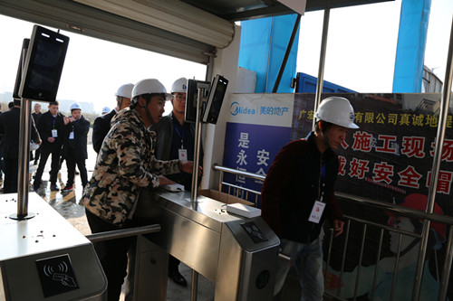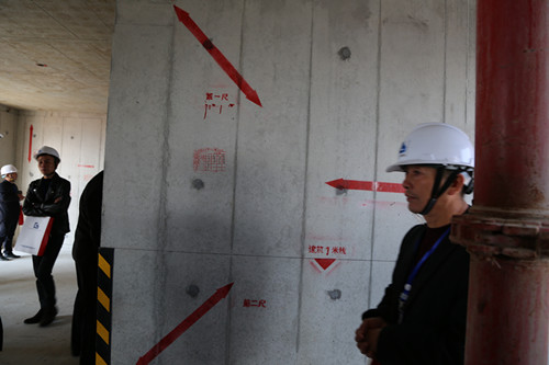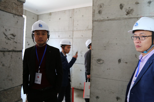 考察团一行参观了人脸识别建筑工程智慧系统、工法样板展示、安全生产体验、砌体和抹灰工艺展示、应用铝模工艺的墙体、铝模工艺展示和安装现场、爬架工艺展示和应用现场、定型产品展示、全剪外墙和文明施工等情况,演示了雾炮、塔吊自动淋喷系统等。