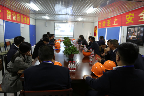 在项目会议室,与会人员观看了美沁园项目应用新工艺和文明施工的PPT专题片,广宏美沁园二期项目经理李立华汇报了美沁园开展新工艺应用和文明施工,浙江建恒建筑科技有限公司副总经理程思军汇报了铝模生产、优势、工期流程、经济分析和安装等,与会人员反响热烈。