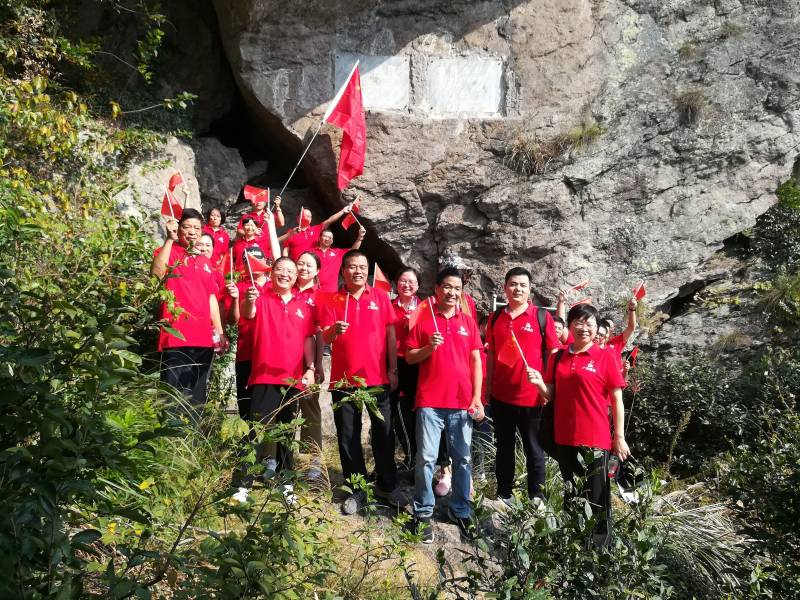 裘家岭村地处我市北部山区,离市区约20公里,曾是永康、东阳经诸暨通杭州的要道。在古朴的裘家岭村,稍作休整,我们就向一大会址——小石婆洞进发。小石婆洞离村约40多分钟的路程。上山的山路依旧保持着土路加岩石相结合的原始形态。山路小径盘曲而上,林中树木茂盛,绿树成荫,路两旁的树像一把把大伞罩在头顶。虽是太阳当头,也不觉得很热。在路上,我们遇到了年已79岁高龄、拥有近50年党龄的老协会长潘为明,他手拿柴刀,正在修剪道路两旁的柴、草,使前往小石婆洞的路宽些,让大家更好地通行。