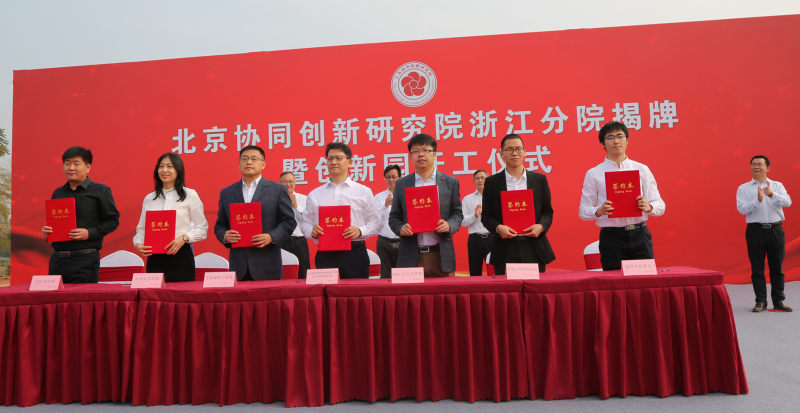 揭牌仪式后,北京协同创新研究院浙江分院首批6个签约项目(《工业探伤X射线数字成像系统》、《单片集成MEMS环境压力传感器》、《智能工业机器人-3D视觉与识别》、《智能型手持式水中特征风险污染物快速分析仪》、《面向100G 光互连的硅基高速调制器驱动器芯片的研制与开发》、《膝关节屈曲畸形康复机器人》)的代表与浙江分院院长李春安进行签约仪式。