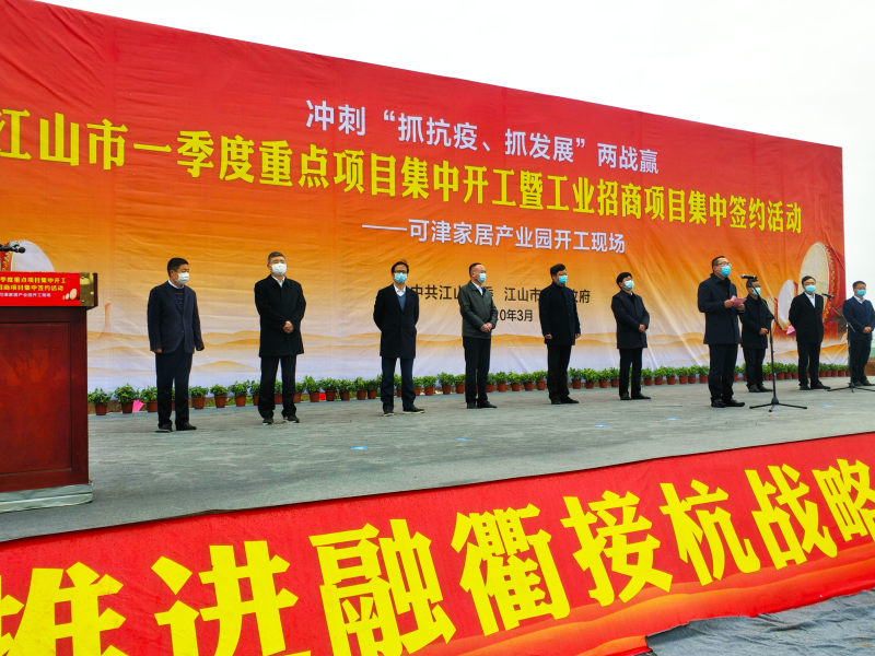 江山市委书记童炜鑫开工仪式上对科润高端装备产业园等10个招商项目签约表示祝贺,并宣布“江山市一季度可津家居产业园等32个重点项目集中开工”。