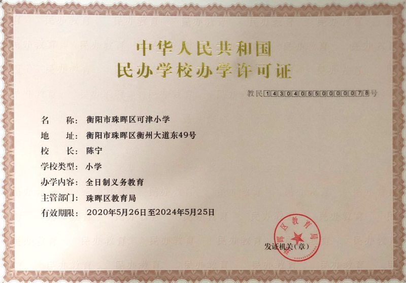 5月26日,从衡阳市珠晖区教育局获悉,由可津控股投资的衡阳市珠晖区可津小学获准《中华人民共和国民办学校办学许可证》,今年9月将迎来首批学生。