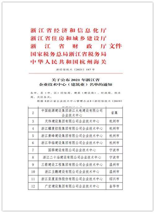 2021年12月6日,浙江省经济和信息化厅、浙江省住房和城乡建设厅、浙江省财政厅、国家税务总局浙江省税务局、中华人民共和国杭州海关等五部门联合下发了《关于公布2021年浙江省企业技术中心(建筑业)名单的通知(浙经信技术〔2021〕187号)》,可津控股旗下广宏建设企业技术中心榜上有名。