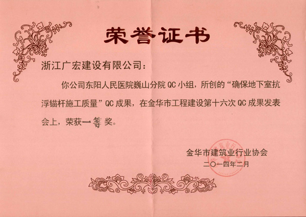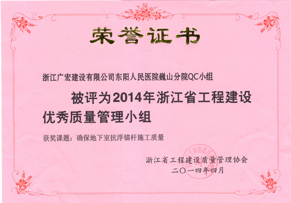 由东阳市人民医院巍山分院项目部所创的《确保地下室抗浮锚杆施工质量》QC成果,继在2014年金华市QC成果发布会上荣获一等奖之后,于近日在杭州召开的2014浙江省工程建设QC成果发布会上,又被评为浙江省工程建设优秀质量管理小组。目前,该课题被推荐至浙江省质量协会。