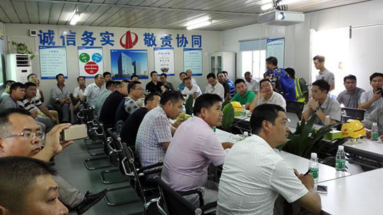 参观结束后回到华亚金融中心会议室,我公司黄开庭副总就劳务管理考核、集中加工(包括木工、钢筋工、泥工)、施工前的图纸优化及施工方案等问题和中天七建总工程师吴少平等领导进行了沟通讨论,认真听取了他们的先进经验介绍,受到了很大启发,获益良多。