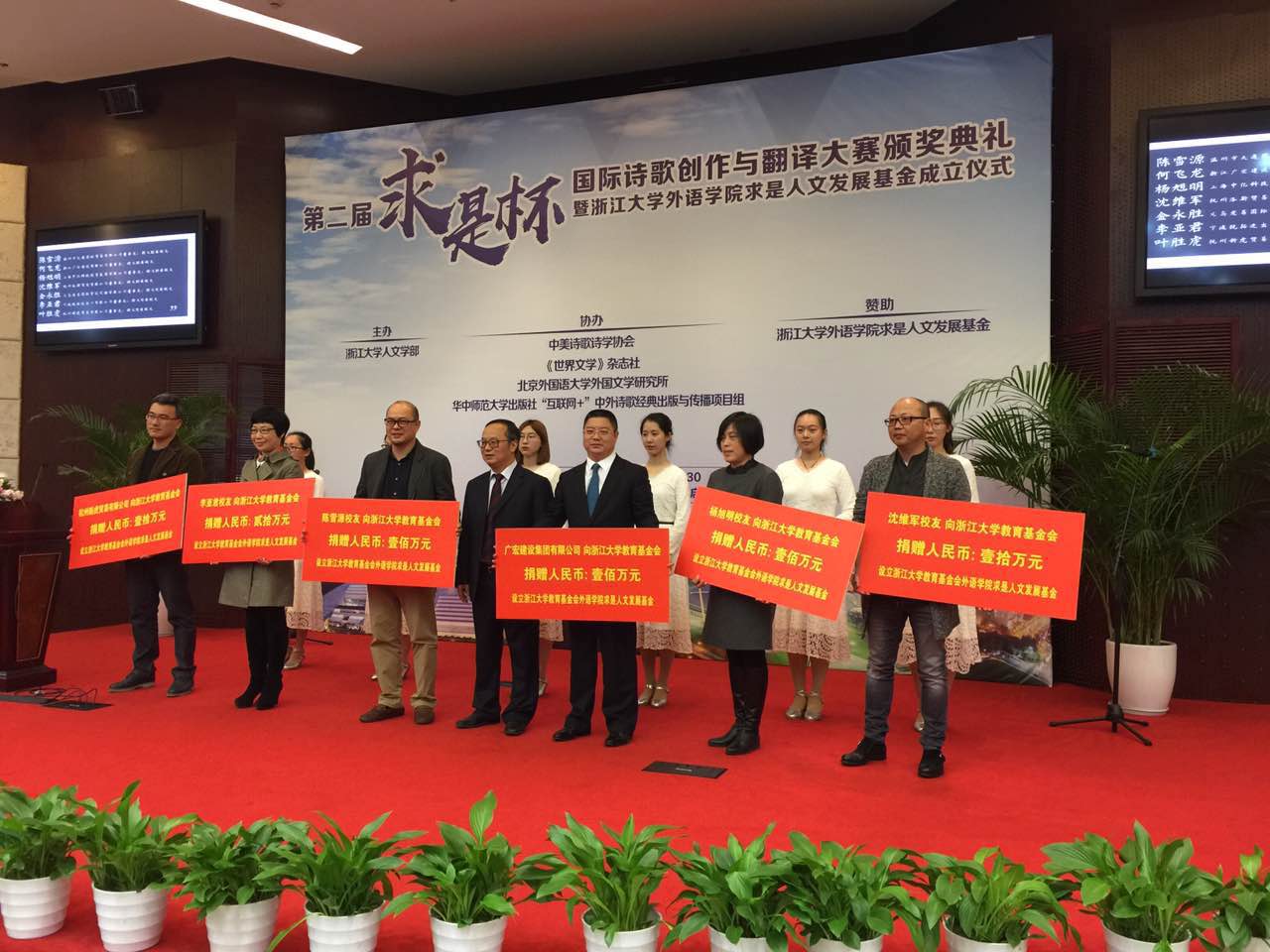 4月1日,浙江大学外语学院求是人文发展基金成立仪式在紫金港校区圆正启真酒店隆重举行。浙江大学常务副校长宋永华,浙江大学社会科学研究院院长何莲珍,浙江大学人文学部副主任、外语学院俄语所所长 王永,外语学院院长程工,外语学院党委书记褚超孚和基金捐赠方校友代表出席仪式。外语学院求是人文发展基金是由广宏建设集团有限公司董事长何飞龙等7位浙江大学外语学院校友发起成立,众筹基金370万元,其中广宏建设集团有限公司出资100万元。基金旨在支持各项人文类活动的举办,主要何飞龙众筹成立浙大外语学院求是人文发展基金包括举办“求是杯”国际诗歌创作与翻译大赛,邀请国内外知名作家、诗人、艺术家及相关领域专家来校讲学,以及举办其他与人文学科发展相关的活动。