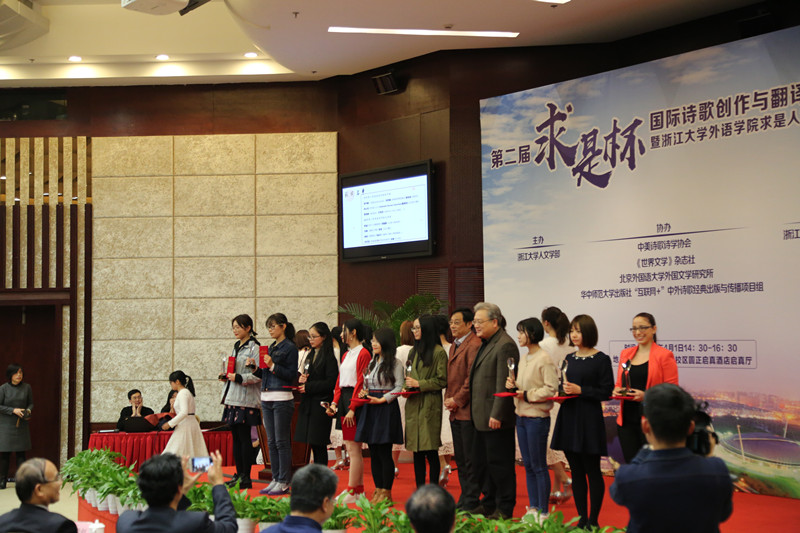 本届比赛从去年10月开始征稿,历时6个多月,收获了来自11个国家,580多所高校,300多个专业,2976份诗稿,经过评委数月斟酌,选出了其中最优秀的27件作品。颁奖典礼上,人我诗社学员表演了实践诗剧《爱的穿越》,分别用法国作家普列维尔的《公园里》演绎《春》、用奥地作家里尔克的《致落乐美》演绎《夏》、用俄罗斯作家阿赫玛托娃的《我依然梦见山峦起伏的巴甫洛夫斯克》演绎《秋》、用爱尔兰作家叶芝的《当你老了》演绎《冬》;诺贝尔文学奖获得者勒克莱齐奥先生发表了热情洋溢的演讲,让大家直面诺奖得主,感受艺术和学术的风采;获得特等奖和一等奖的作者上台朗诵获奖作品,评委点评,呈现读诗品诗,体会诗歌魅力;现场设置了抽奖环节,通过抽奖选出3名幸运观众,赠送4月2日西湖龙井诗会的珍贵席位,让幸运观众拥有与勒克莱齐奥先生以及诗人们相约龙井诗会,一起在龙井茶的清香中朗诵佳作、品茗畅谈。