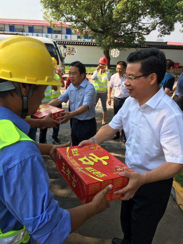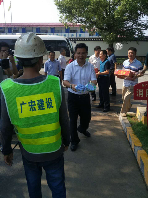 2017年7月24日上午,金华市长暨军民等一行冒着高温酷暑来到广宏建设集团建设工地——“金华信息经济产业园”项目部,为坚持战斗在一线的广宏员工送来了高温慰问品和党委政府的亲切问候。