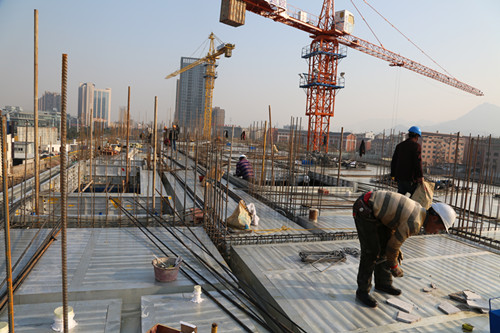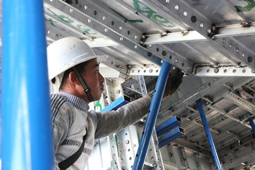 在铝模安装现场,东阳分公司副经理王永良兴奋地说,铝模板从工厂到工地,板材、卡具等都是按照图纸标准生产和包装,不会有多余的板材和卡具,安装完毕后现场整洁如洗。现场安装师傅只有几名是从建恒铝模厂过来的,大部分还是原来的木模工,安装技术简单易学。下图是钢筋工在铝模板上扎钢筋,除了钢筋、扎丝及工具外,并无铝模等垃圾存在。