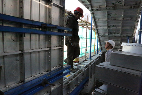 绿色建筑、环保建筑是建筑发展的必然趋势。公司总经理助理、工程管理部部长何国栋介绍说,铝模工艺与传统木模工艺相比具有很多优势,一是高效,安装速度快,装拆简单快捷,对工人技术要求不高。一般一个楼层只需4-5天,比木模工艺快2-3天;二是有利文明施工。铝模是按照建筑图纸进行工厂化生产,标准、规范,施工环境整洁,施工废料少,几乎不产生建筑垃圾,不使用铁钉及其他易耗材料,符合“建设美丽中国”绿色环保理念,模板材料可再生,减少因使用木模而导致的森林砍伐和水土流失;三是工程生产和质量安全有保障。铝模承载能力高,爆模、胀模等现象较少,楼梯构造柱、门窗过梁、止水反边、沉池反坎等小尺寸二次构件一次成型,效果良好,可有效解决外墙、门窗、卫生间等的渗漏等问题。又因铝模平整光洁,做出来的混泥土平整度、垂直度、板顶极差等比木模工艺均好;四是节约成本。一幢33层高的建筑,应用铝模每平方成本约20元,比木模工艺减少5元左右,脱模后平整度和精度高,可免去表面抹灰,节约了装修费用。
