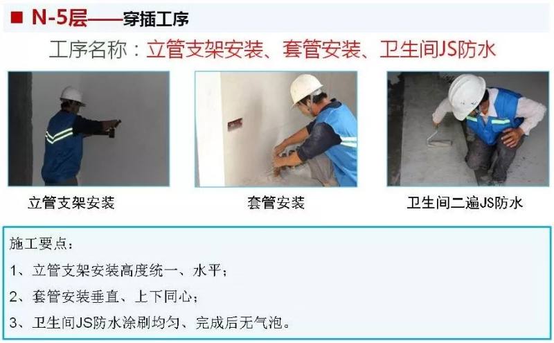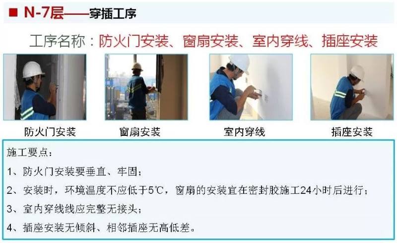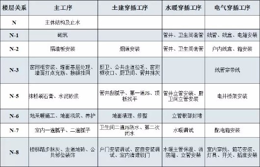 ➤ 大穿插施工是将每栋楼施工过程由上到下分为N、N-1、N-2、……N-8层,分主体结构、二次结构、基层处理及打点冲筋、抹灰、地采暖及地面施工、腻子施工、各构件及设施安装交付7道主工序,每道主工序均按照6天(常规主体施工大约为6天/层)一层等节奏流水,并分土建、水暖、电气专业配合穿插工序施工。