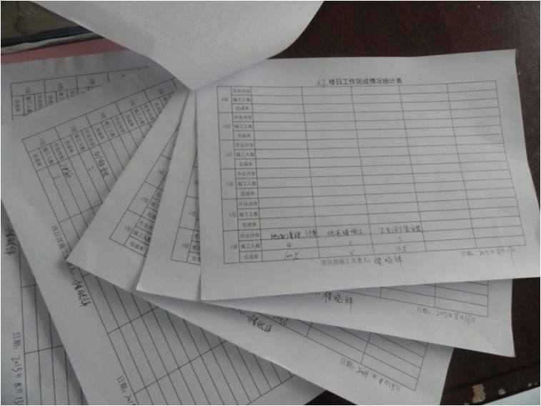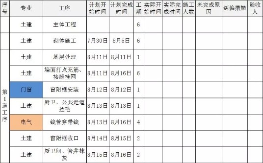➤ 在施工过程中,每天按计划完成工作任务,每天记录实际开始时间、实际完成时间、施工人数、未完成原因、纠偏措施、验收人,确保按组织计划完成施工任务。