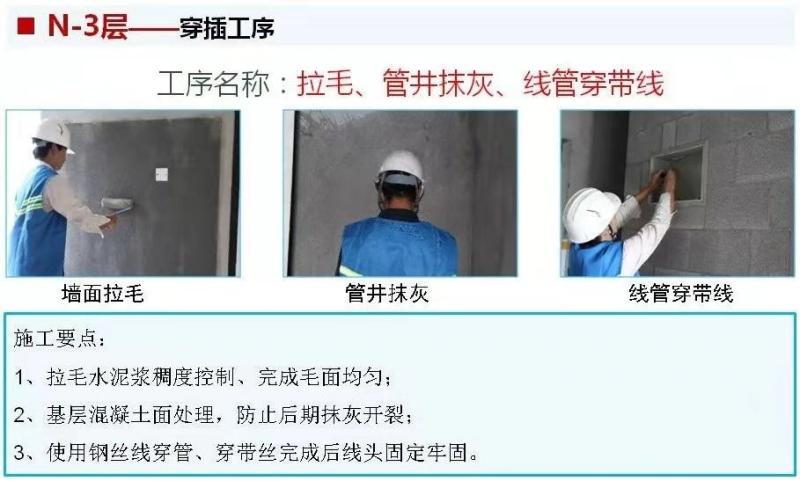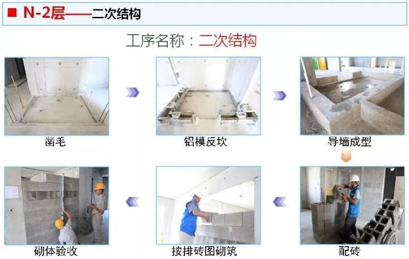 ➤ 专业流水施工:混凝土、钢筋、砌筑、抹灰、粉刷石膏、腻子专业流水施工,通过精细化的工序分解和统筹,定量化材料配送,识别各分项作业中单一、重复、独立的作业内容,实行专人专岗流水施工,提高劳动效率和一次成活率。