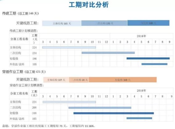 本工程住宅层高23、26层,推行大穿插作业施工相比传统施工工期可缩短71天,工期缩短约11.16%。如果30层